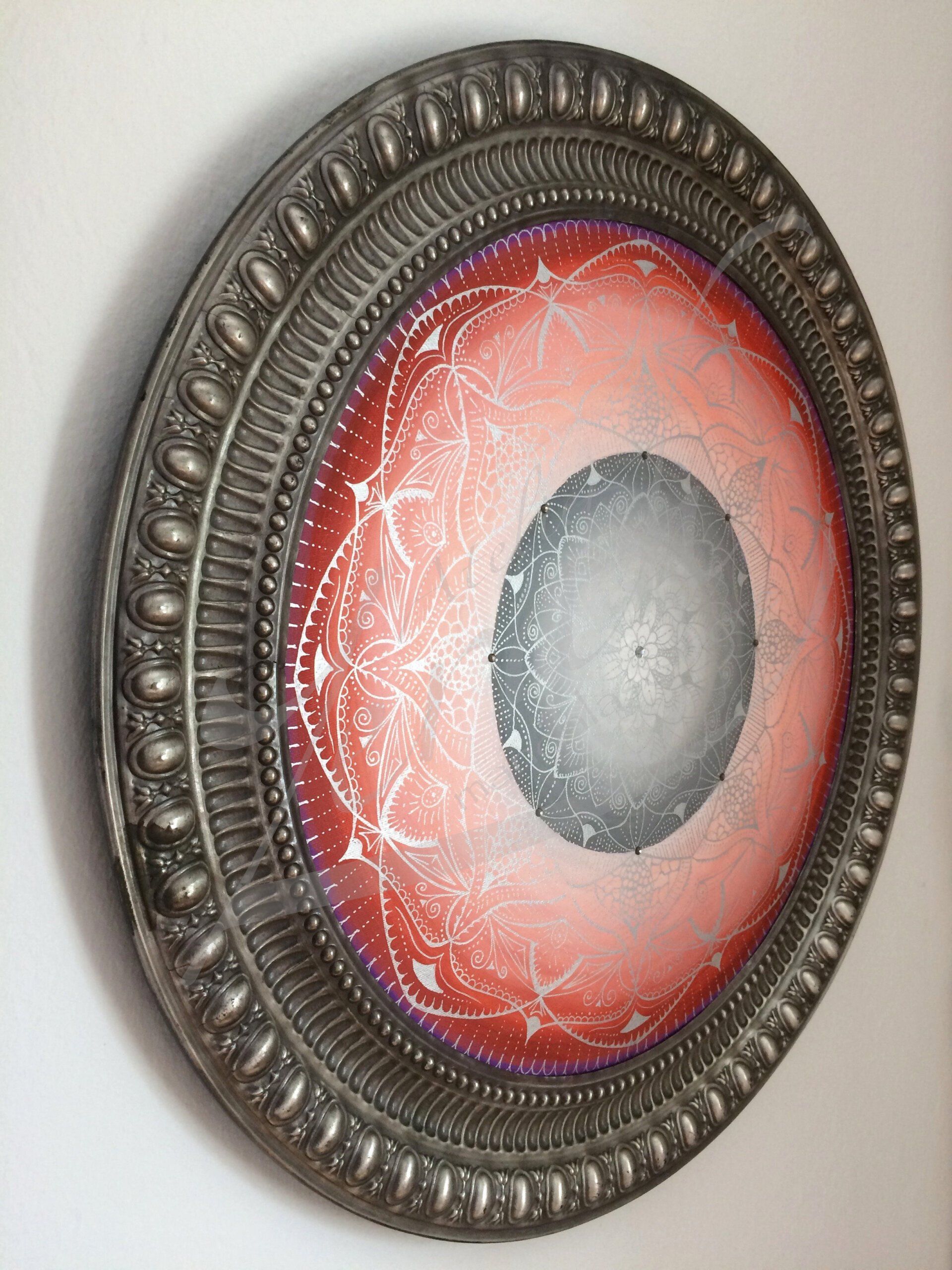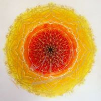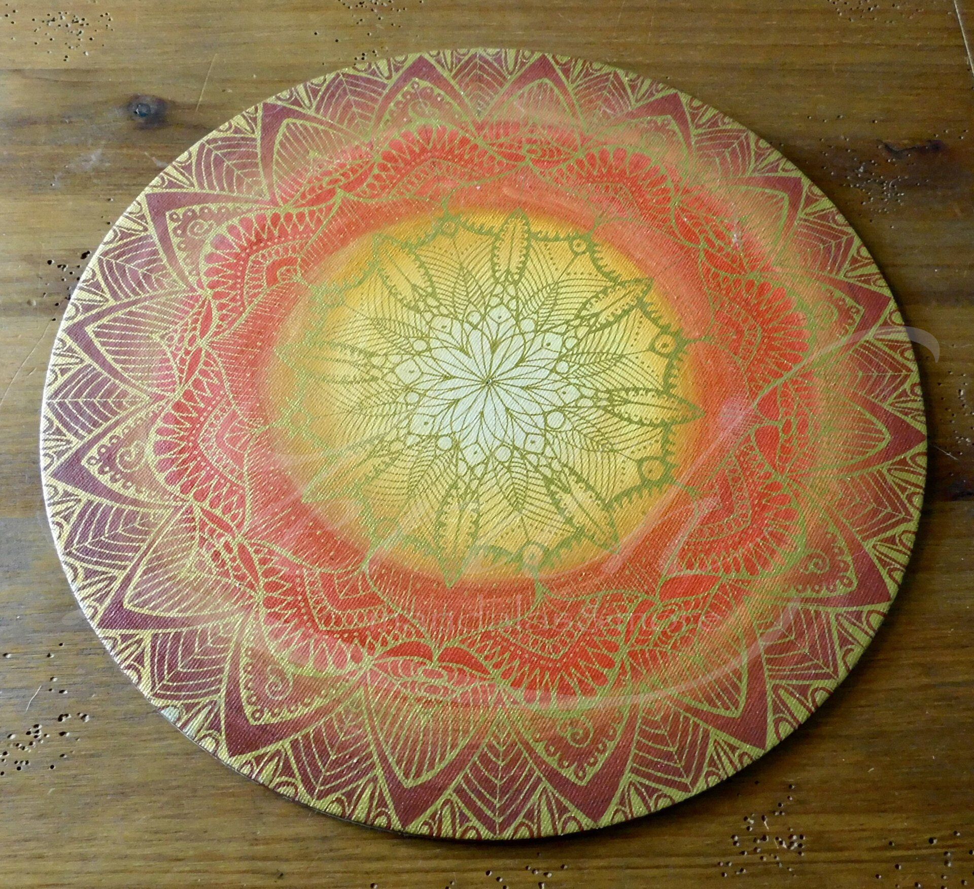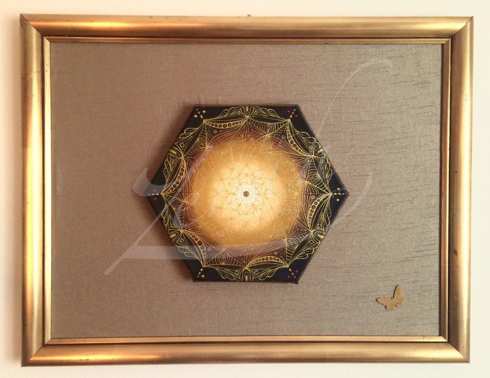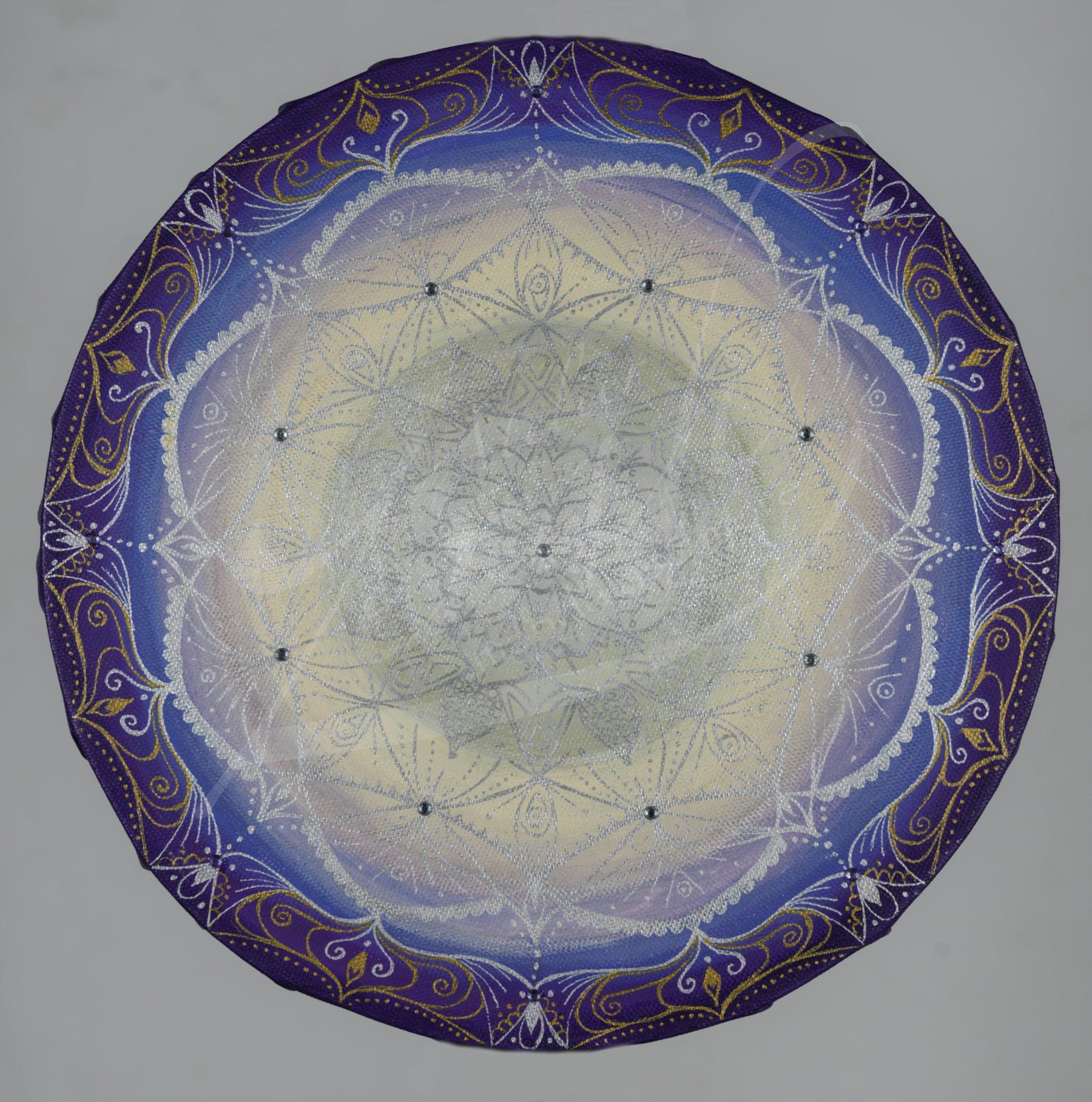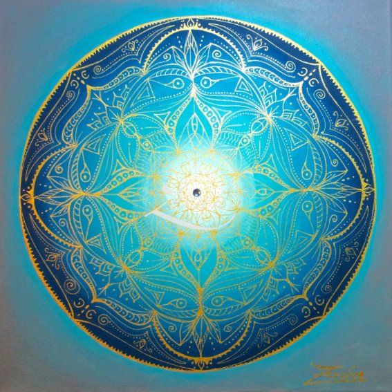 Während das Motiv wächst, fließen Stimmungen, Emotionen, Wünsche und Gedanken mit ein, die jedes meiner Mandalas einzigartig machen. Das Endergebnis ist nie genau vorhersehbar. Mit jedem Strich, mit jeder Teilfläche verändert sich das Gefüge bis ein einheitliches Ganzes entsteht. Durch die feinen Farbabstufungen leuchten meine Mandalas aus der Mitte heraus und erhalten manchmal - je nach Blickwinkel des Betrachters - so manch überraschenden 3-D-Effekt. Besonders lebendig werden sie, wenn das Sonnenlicht direkt mit den Linien spielt und sie zum Strahlen bringt. Teilweise eingesetzte Schmucksteinchen verstärken die funkelnde Wirkung.