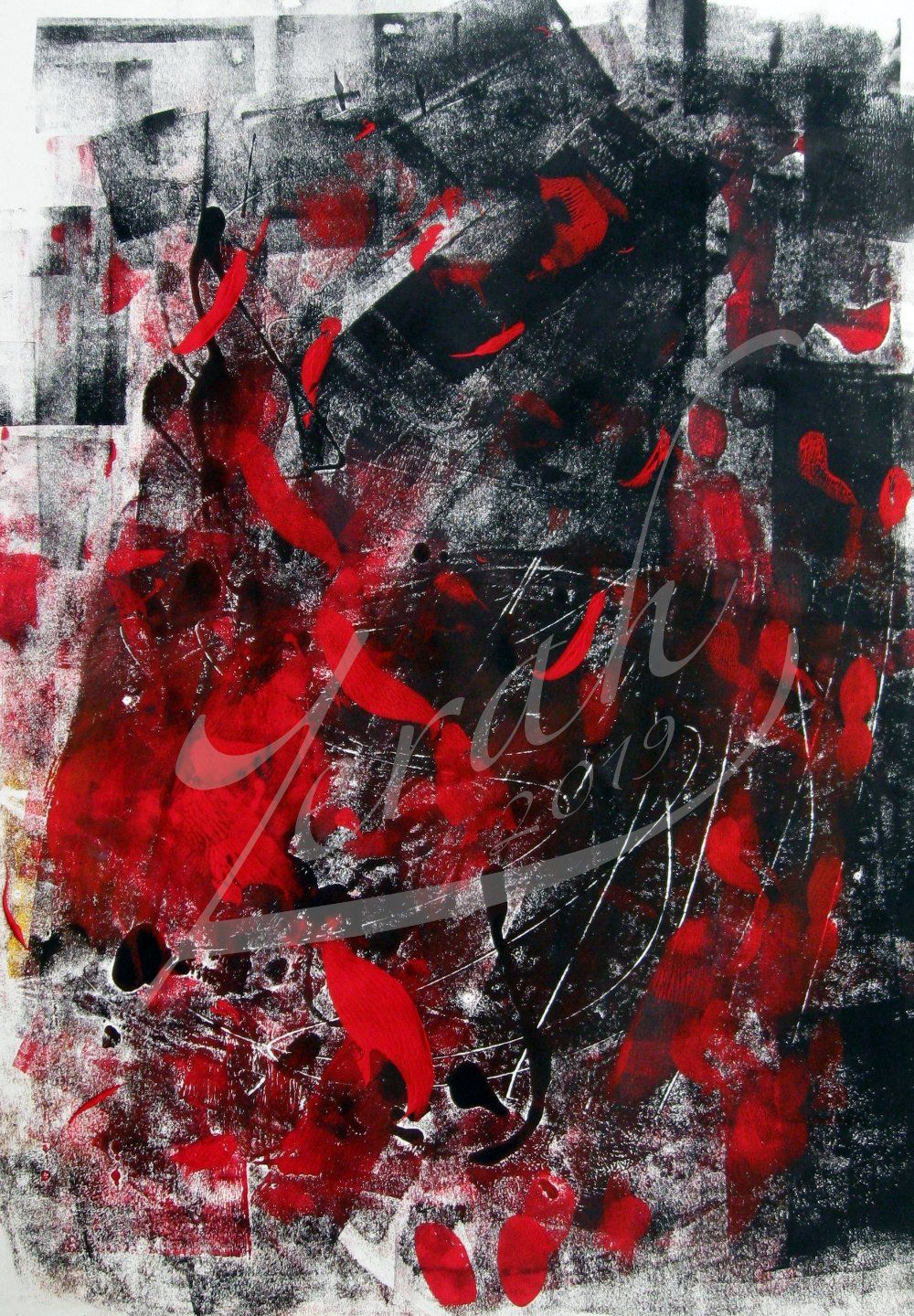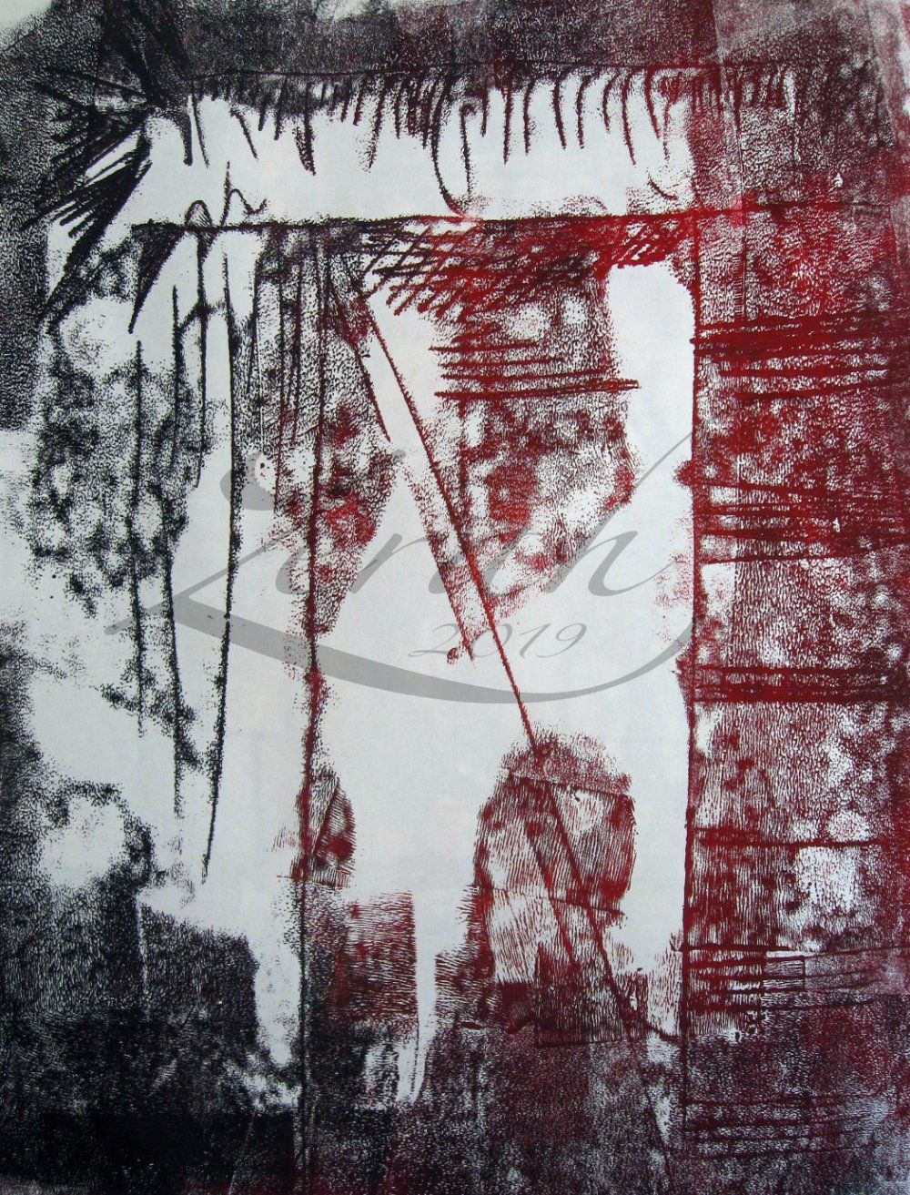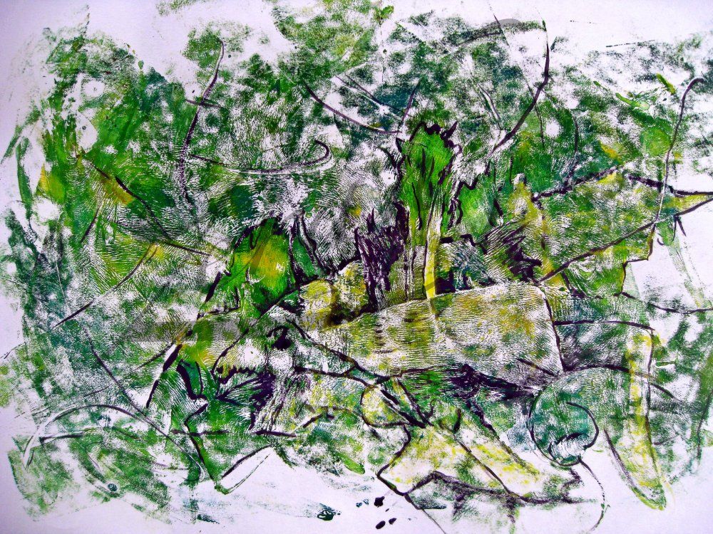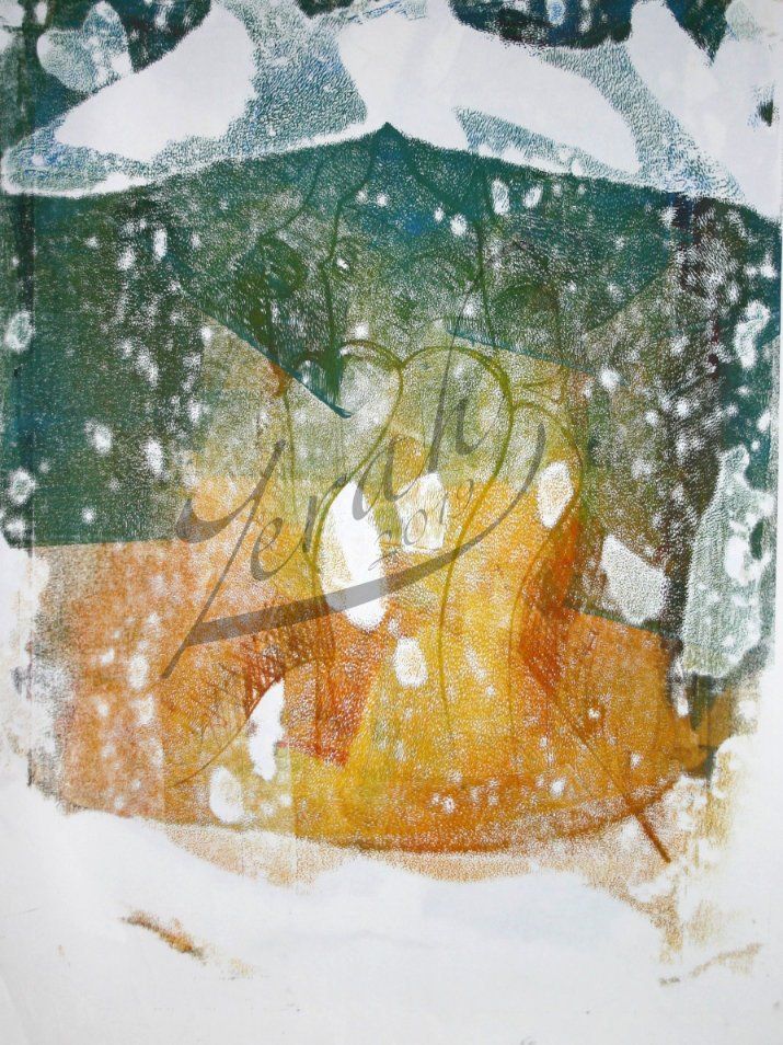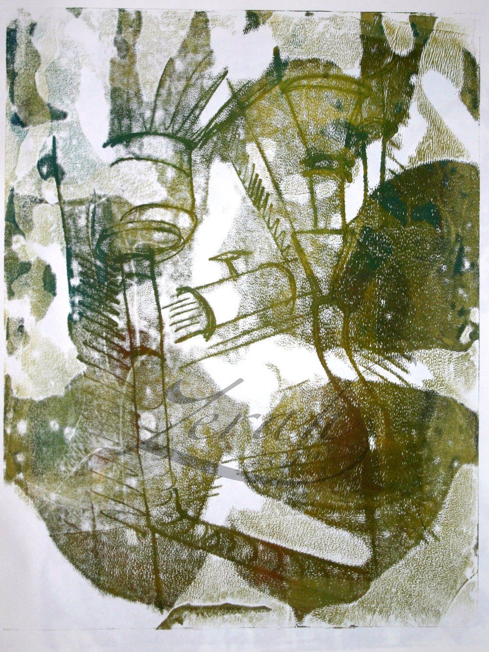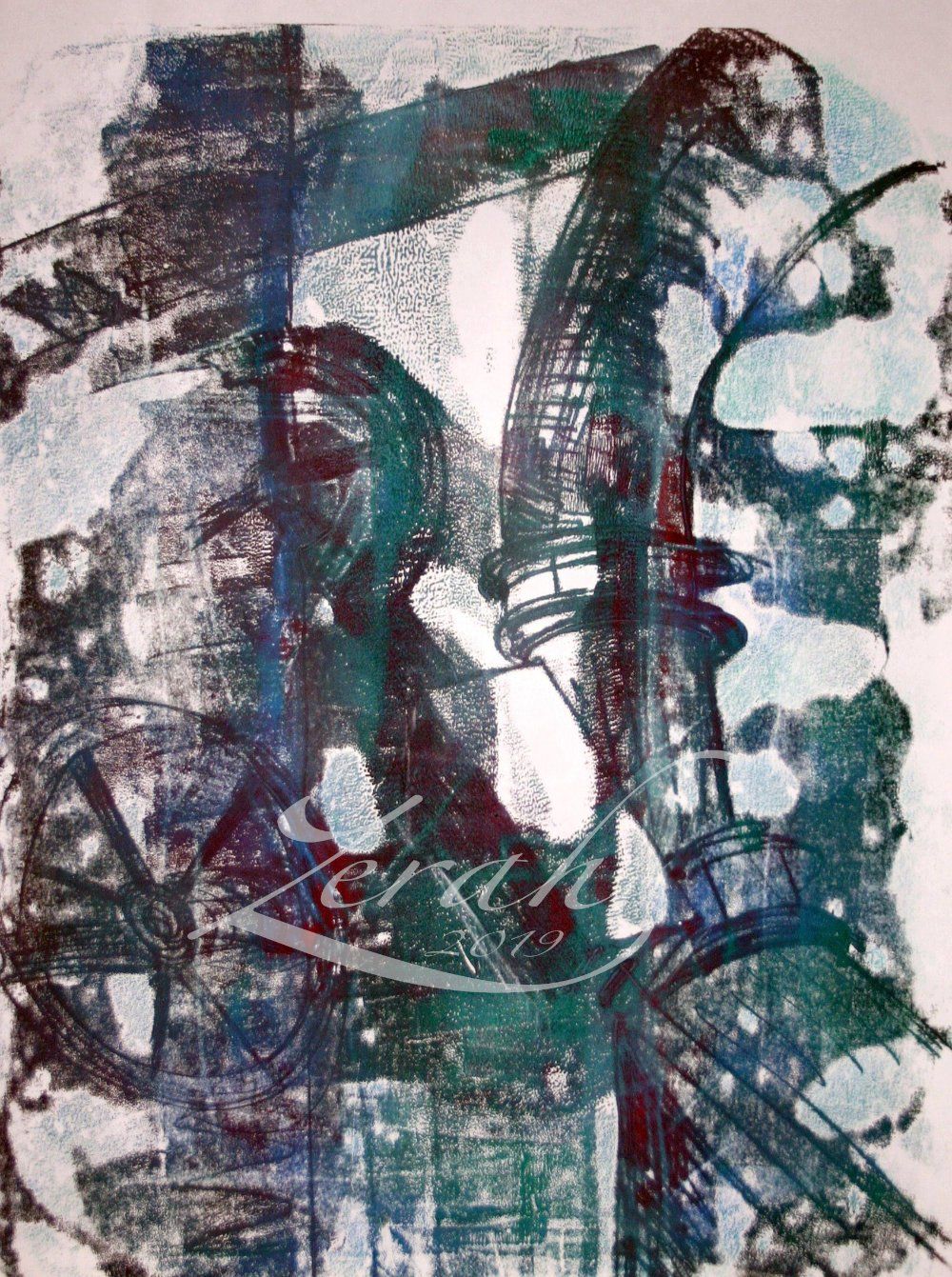 Eine Drucktechnik, die meist nur einen einzigen Abzug ermöglicht. Die so entstehenden Motive beinhalten meist zufällige und spontane Elemente, die zum Weitergestalten einladen. Das macht diese Technik so abwechslungsreich, herausfordernd und spannend. Alle Arbeiten sind mit wasserlöslicher Druckfarbe auf speziell dafür geeignetem Papier gedruckt. Teilweise habe ich sie noch grafisch mit Pastellkreiden, Finelinern und Tusche überarbeitet, um bestimmte Formen zu betonen.