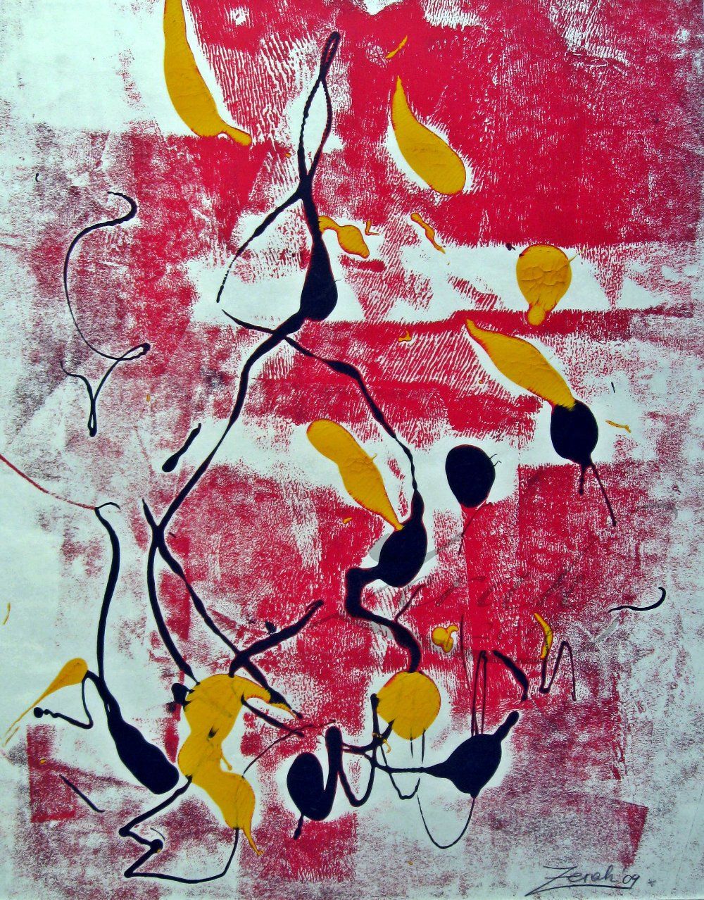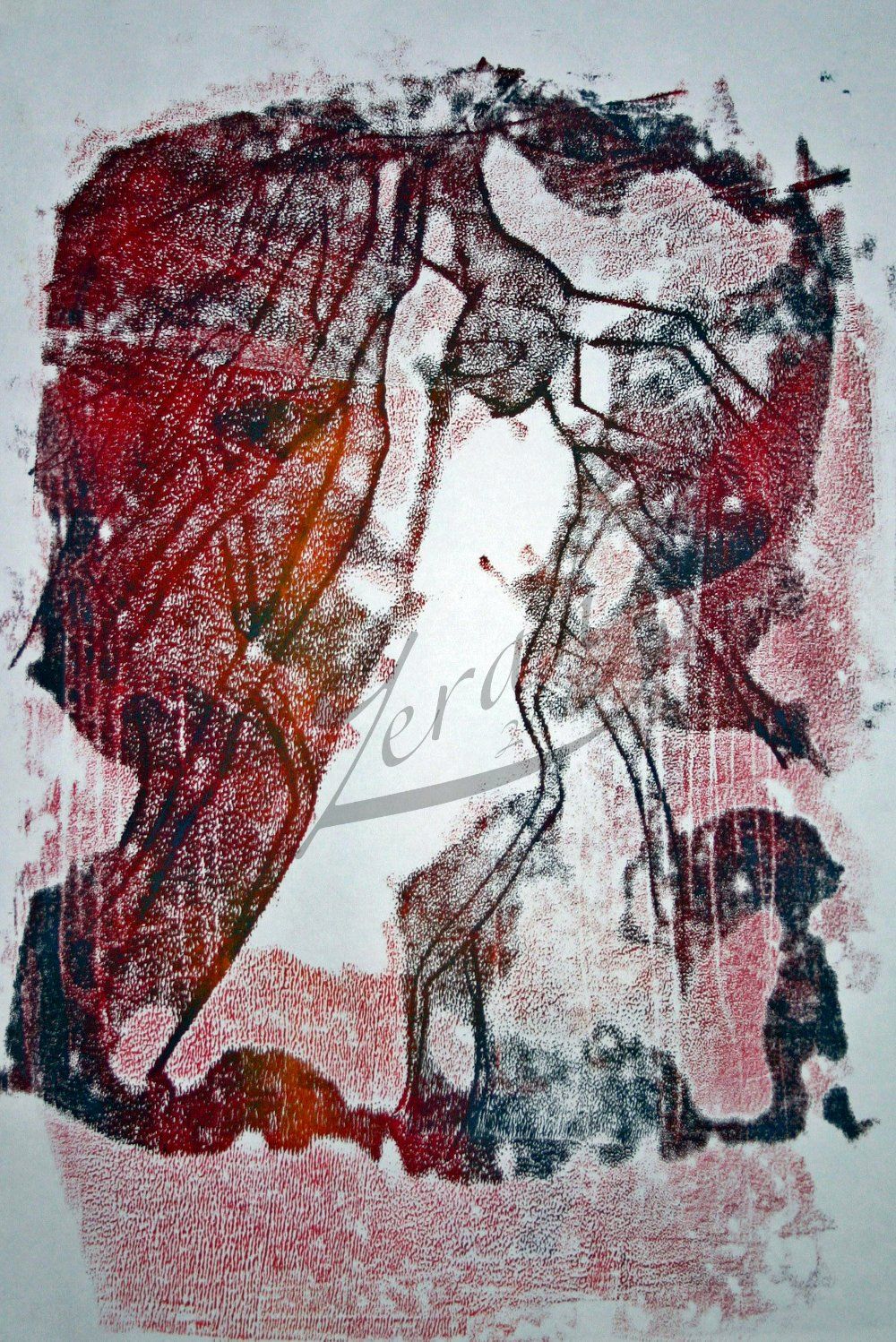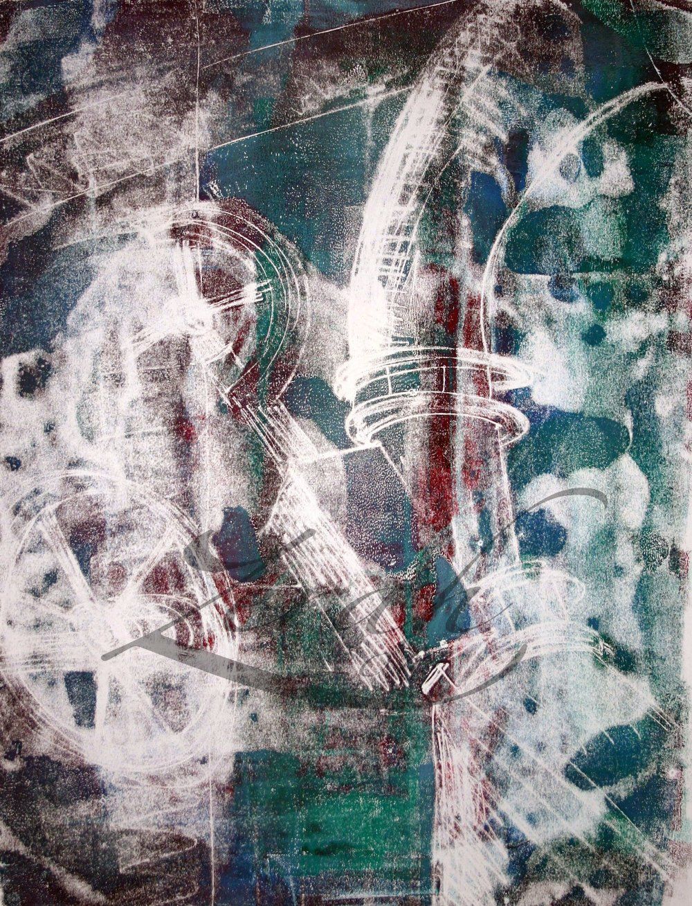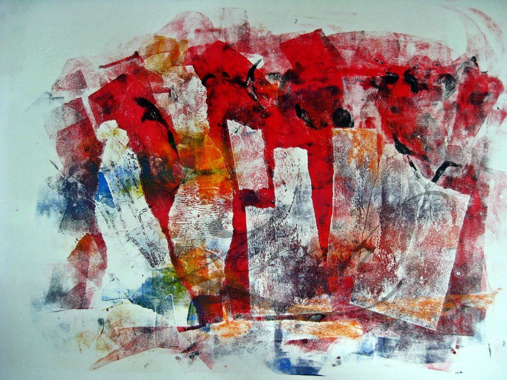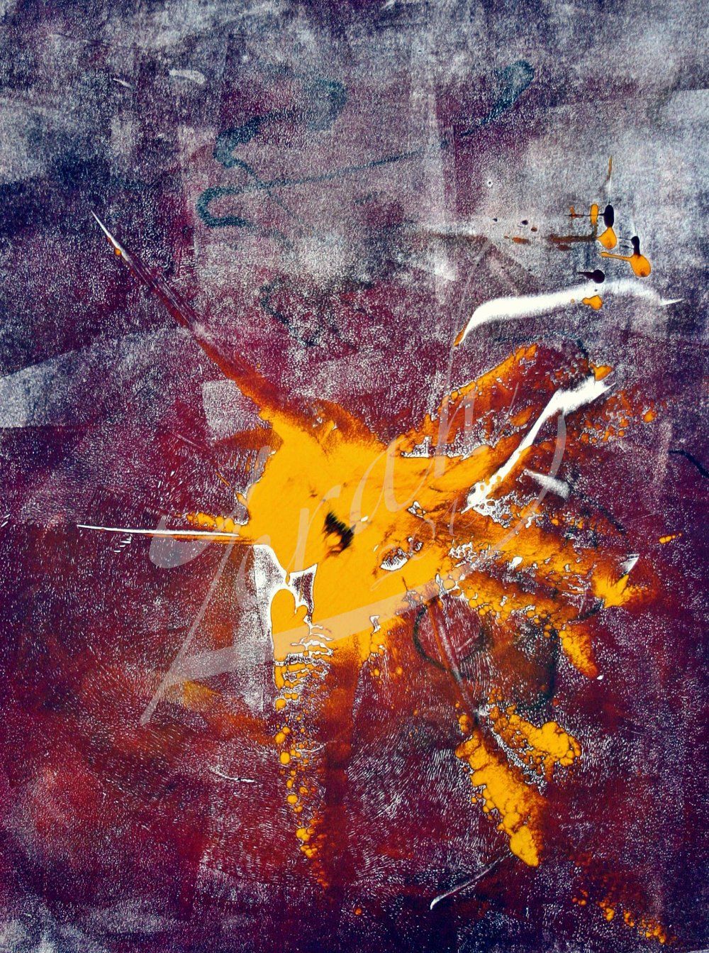 Eine Drucktechnik, die meist nur einen einzigen Abzug ermöglicht. Die so entstehenden Motive beinhalten meist zufällige und spontane Elemente, die zum Weitergestalten einladen. Das macht diese Technik so abwechslungsreich, herausfordernd und spannend. Alle Arbeiten sind mit wasserlöslicher Druckfarbe auf speziell dafür geeignetem Papier gedruckt. Teilweise habe ich sie noch grafisch mit Pastellkreiden, Finelinern und Tusche überarbeitet, um bestimmte Formen zu betonen.