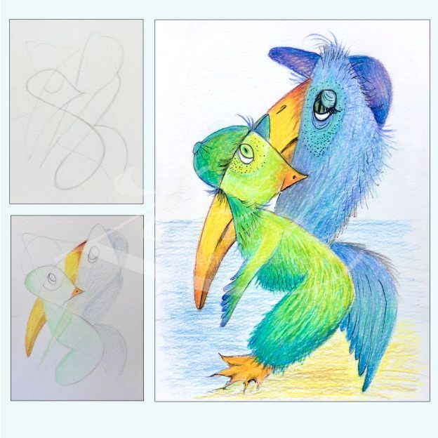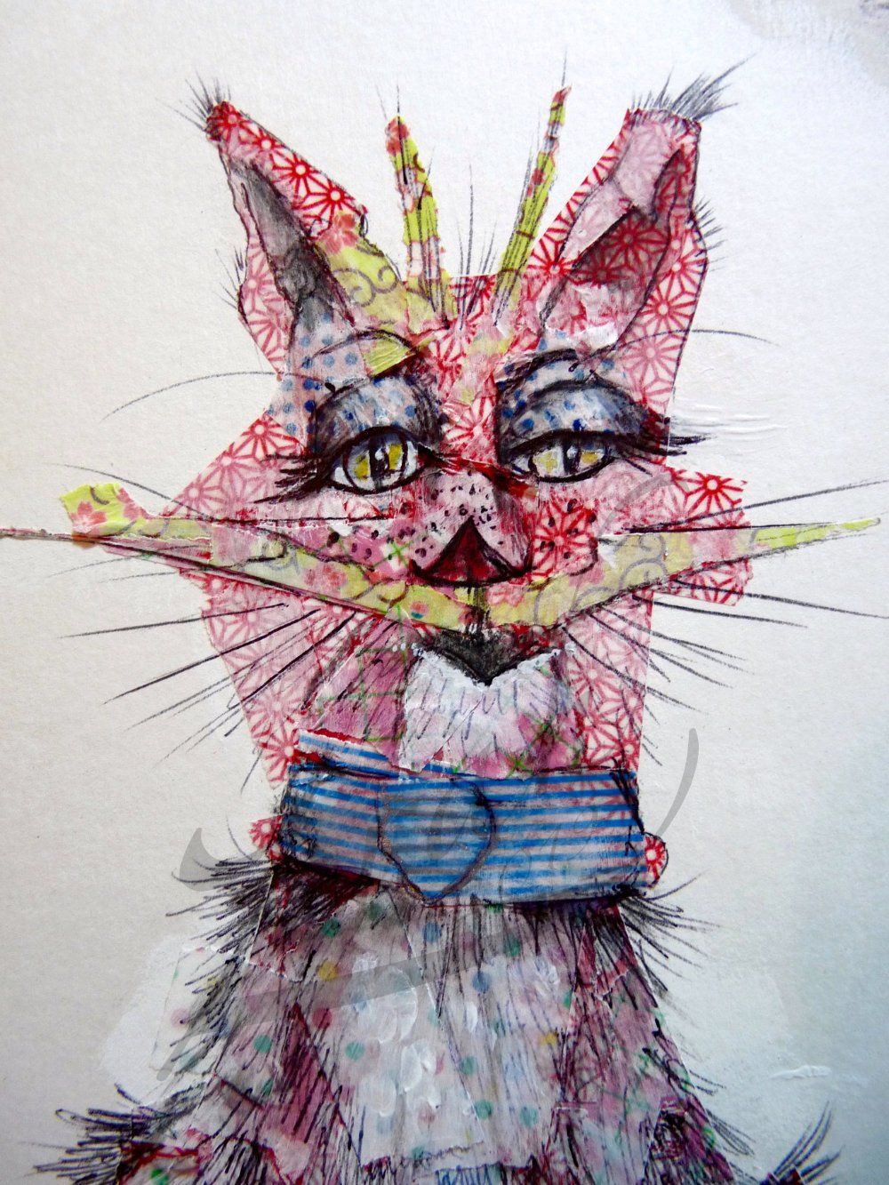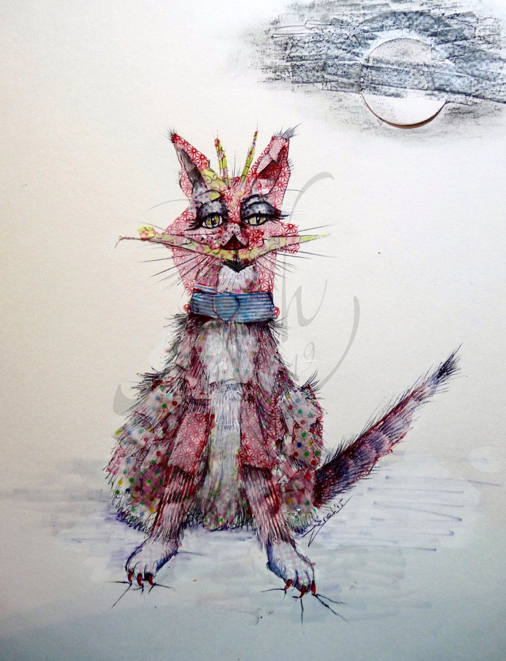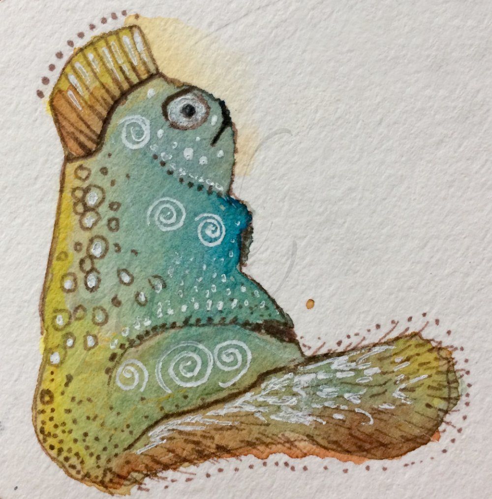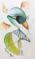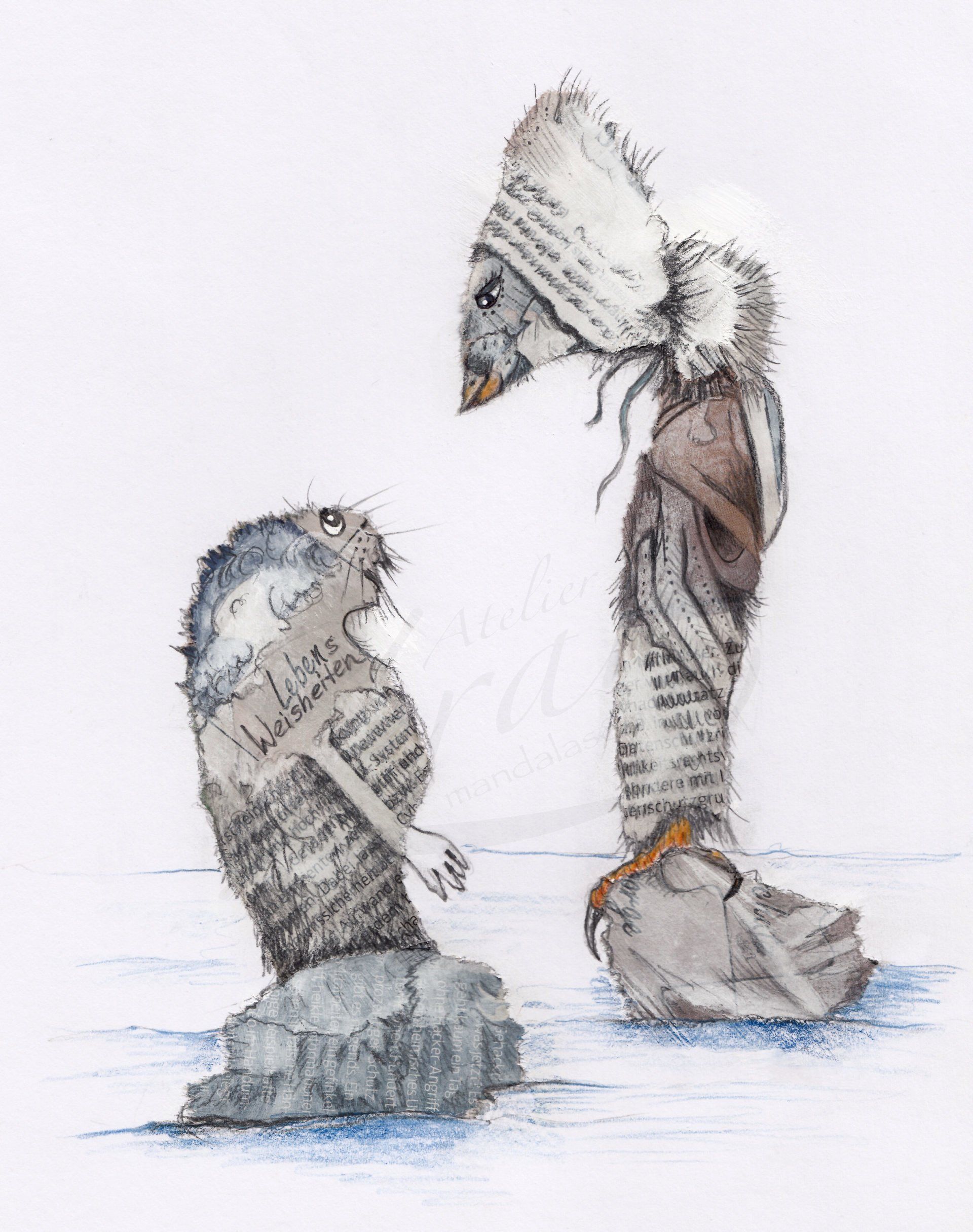 Sie entwickeln sich aus Teilen von Monotypien, spontan entstehenden Farbflächen und grafischen Elementen, sowie aus gerissenen Teilchen verschiedener Papierarten und Washi-Tapes. Es macht mir großen Spaß zu entdecken, welche Persönlichkeiten hier zum Vorschein kommen wollen. Durch Linien, Muster und grafische Texturen verleihe ich ihnen ihren individuellen Charakter und erwecke diese Kreaturen zum Leben. Meist beinhalten diese Wesen auch Botschaften und Hinweise auf persönliche Themen sowie die aktuelle Stimmungslage.